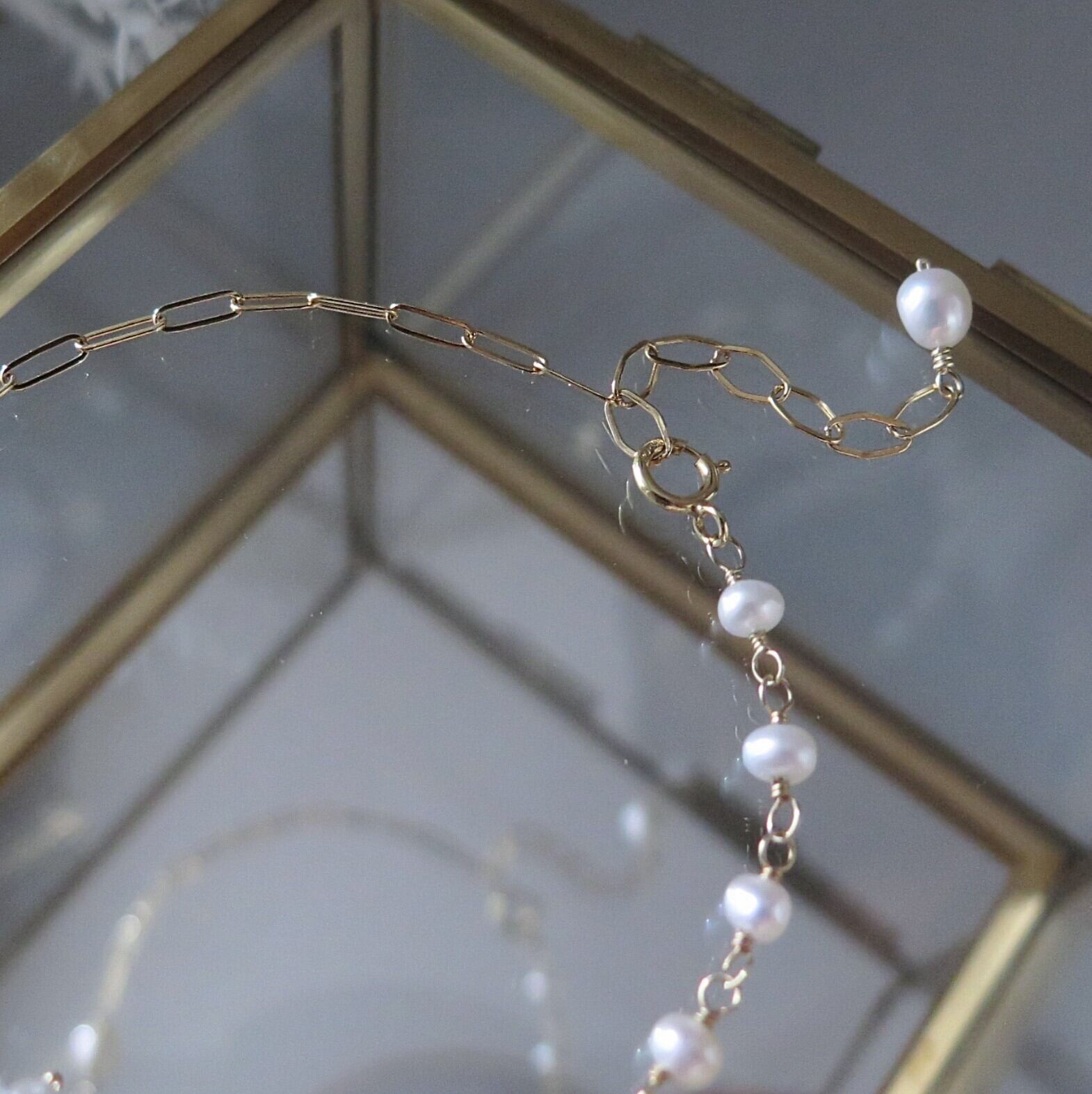 大小パールで動きを出し、華奢なチェーンでスタイリッシュに