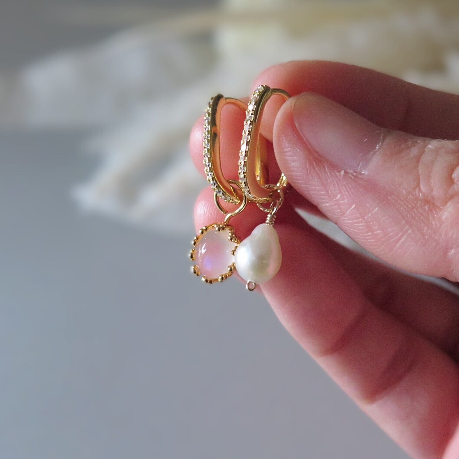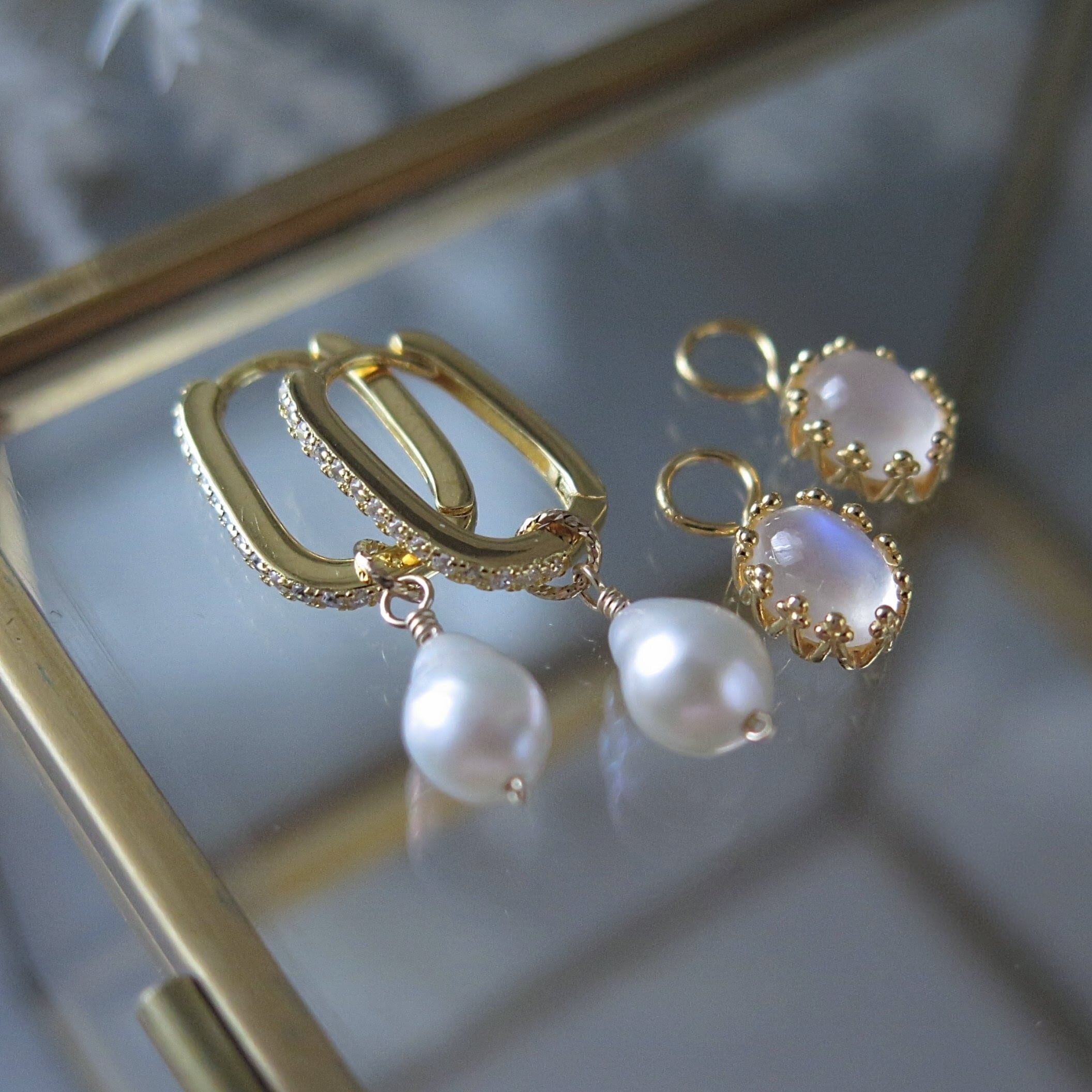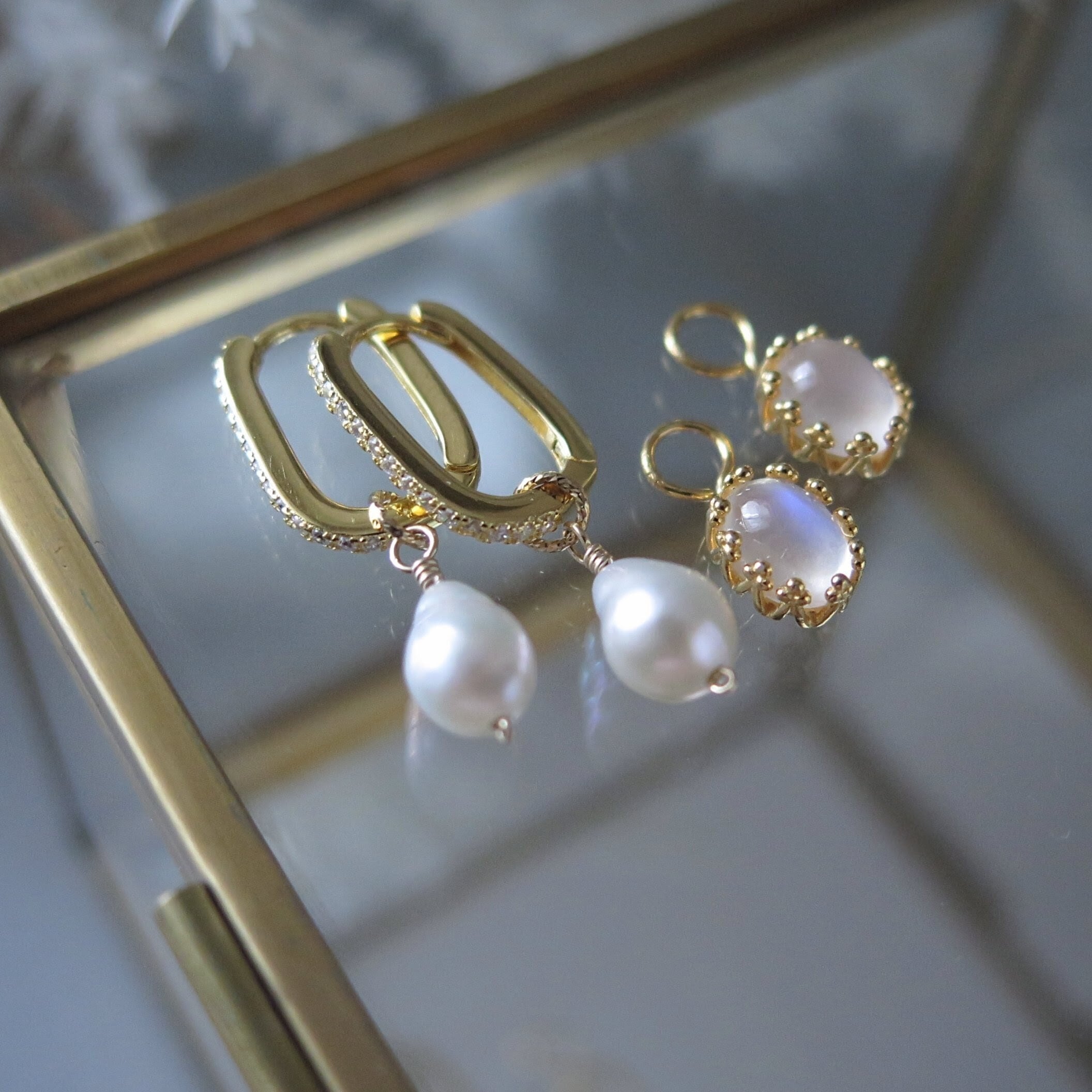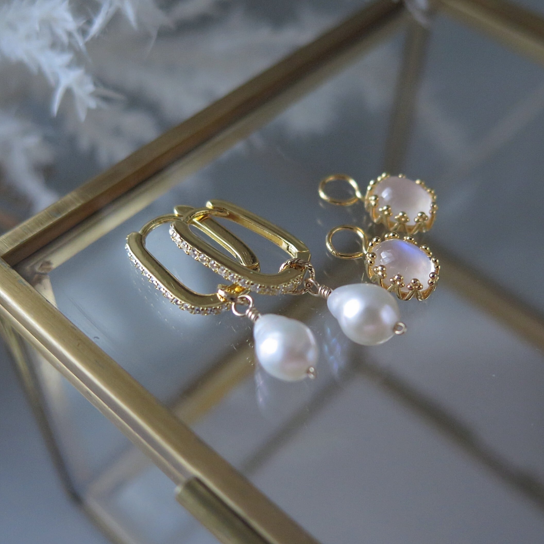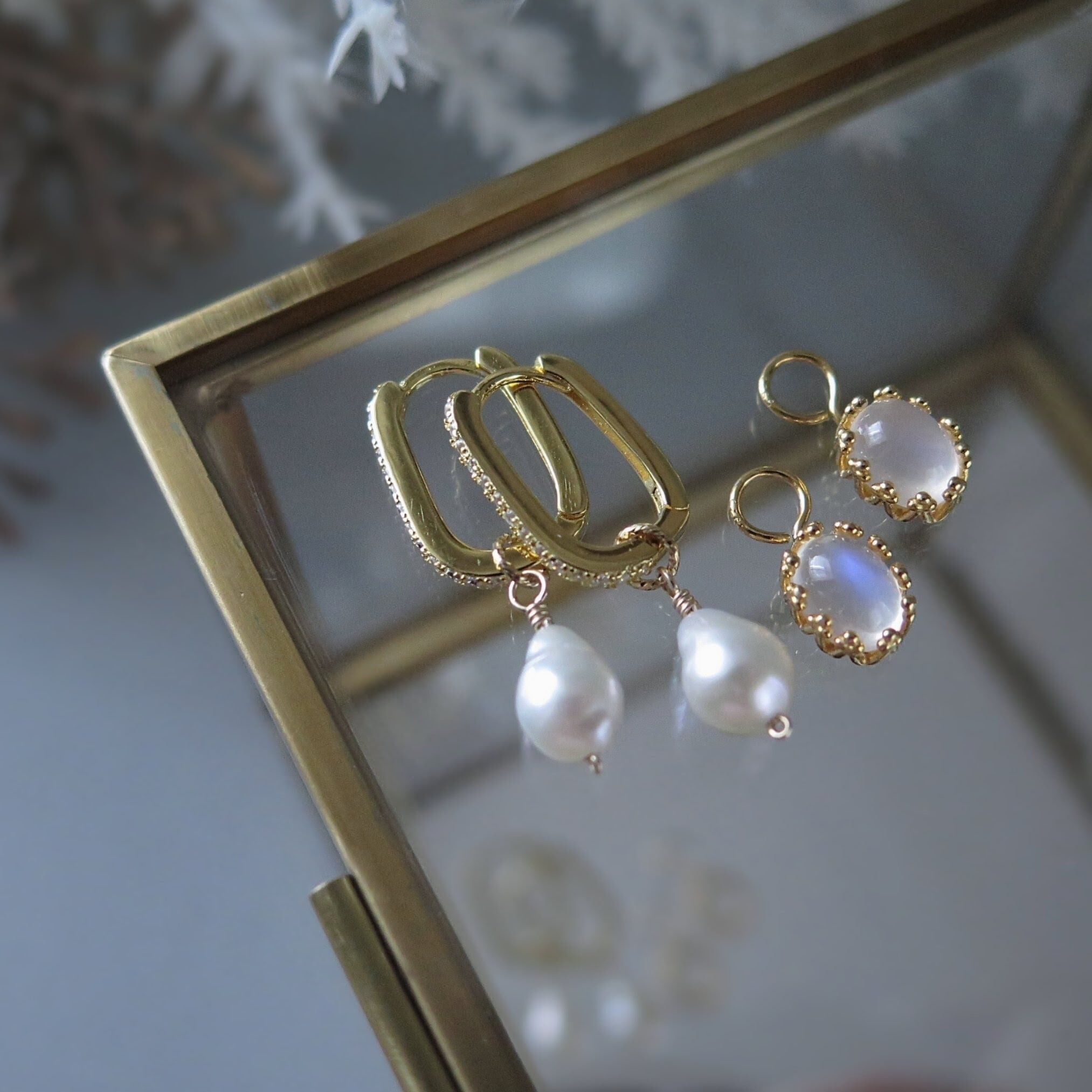 ペリステライト&バロックパールチェンジャブルチャーム*スクエアフープピアス/イヤリング